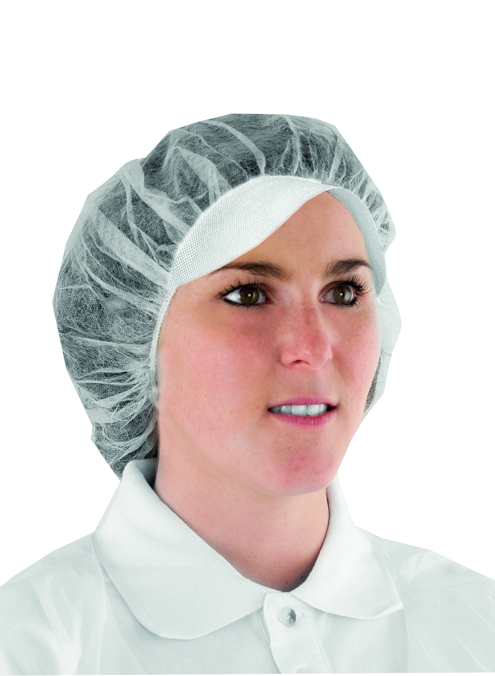 Charlotte jetable en polypropylène blanc avec visière.