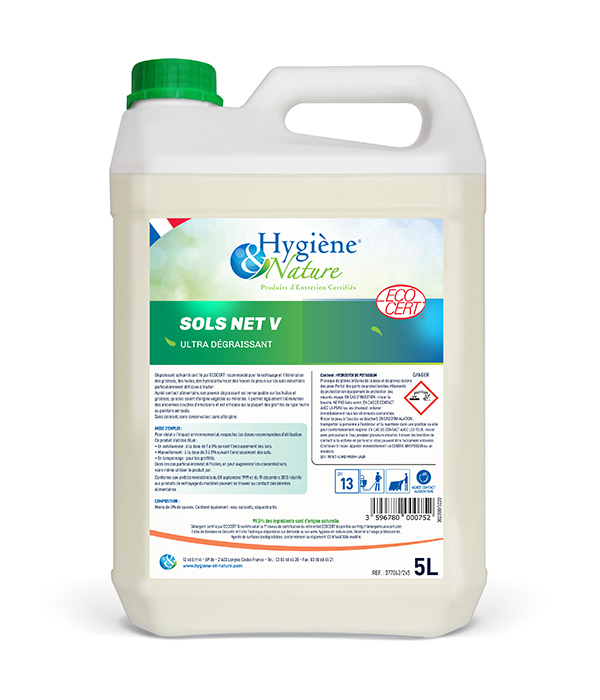Dégraissant solvanté certifié par ECOCERT recommandé pour le nettoyage et l’élimination des graisses, des huiles, des hydrocarbures et des traces de pneus sur les sols industriels particulièrement difficiles à traiter. Sols Net V permet également l’élimination des anciennes couches d’émulsions et est efficace sur la plupart des graffitis de type feutre ou peinture aérosols. Agréé contact alimentaire, son pouvoir dégraissant est remarquable sur les huiles et graisses, qu’elles soient d’origine végétale, animale ou minérale. Il convient pour le traitement de surface, pour la préparation des pièces avant peinture, pour l’entretien des supports, pour le dégraissage mécanique. Il est composé de 99.5% d’ingrédients d’origine naturelle. Il est sans colorant, sans conservateur, sans allergène.