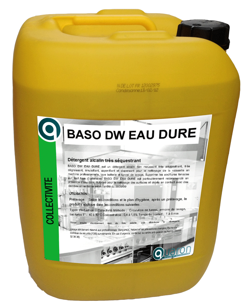 BASO DW EAU DURE est un détergent alcalin non moussant très séquestrant, très dégraissant, émulsifiant, saponifiant et dispersant pour le nettoyage de la vaisselle en machine professionnelle, lave batterie et tunnel de lavage. Supprime les souillures tenaces sur tout type d’ustensiles.